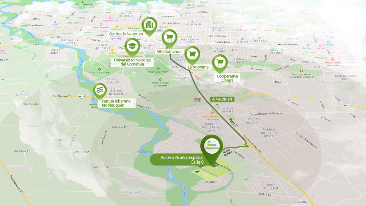 Nuevo Rocío se encuentra en una ubicación estratégica, en el límite entre las ciudades de Neuquén y Centenario, con acceso rápido y directo desde Calle 0, en Nueva España.